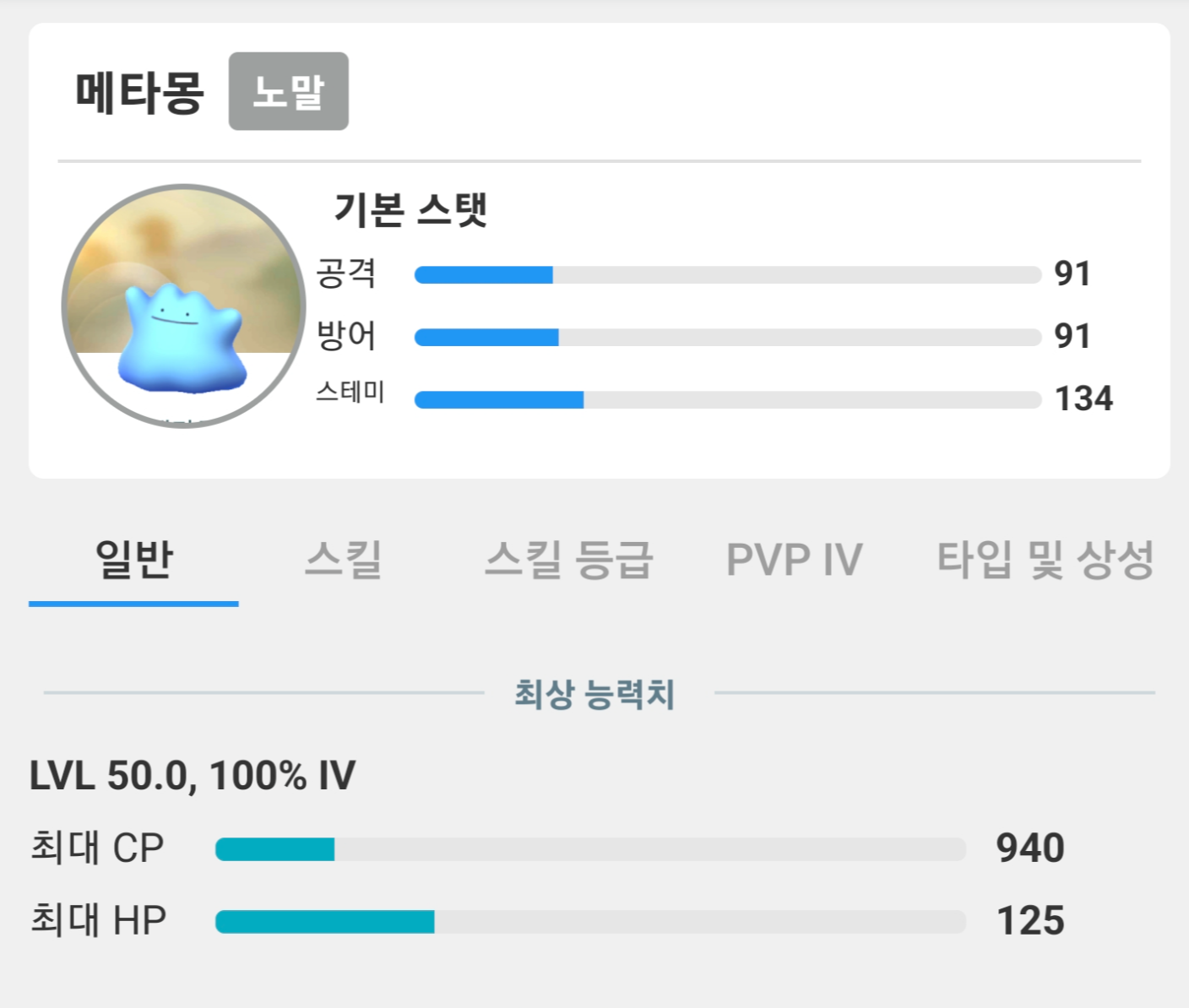 참고용으로 메타몽의 50 레벨 계체값 100의 CP는 940입니다!